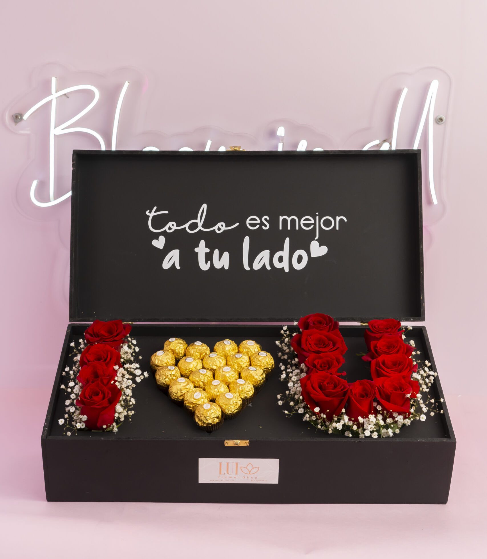 Caja de I Love U, con chocolates terreros y rosas, escoge una de las frases pre-seleccionadas.